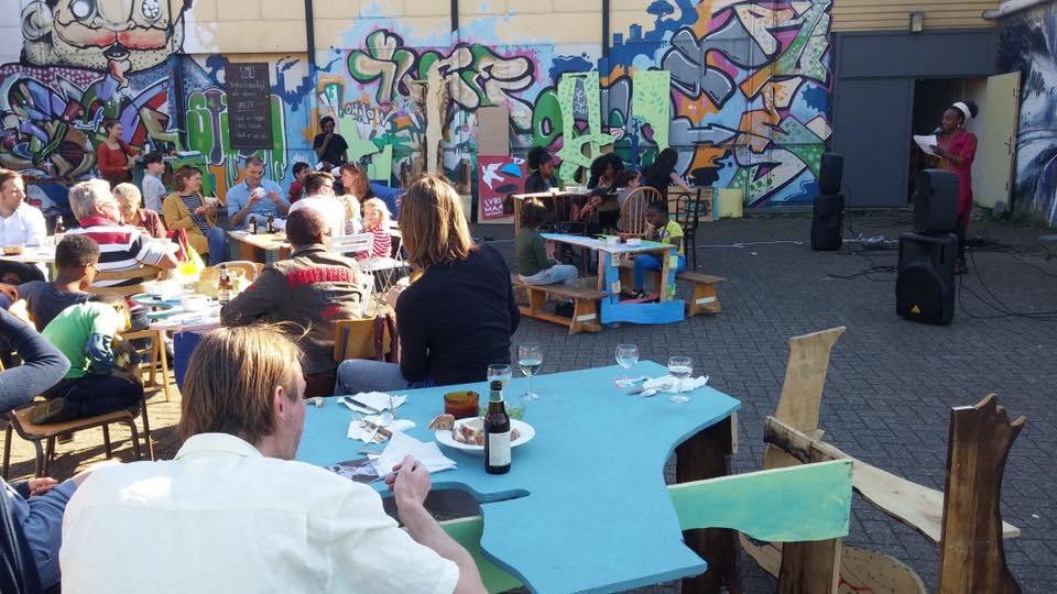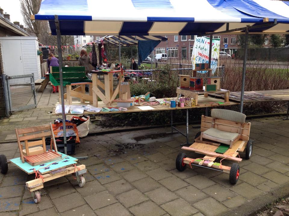 Voor een vrijheidsmaaltijd in Amsterdam Noord bouwen bezoekers eerst samen tafels om aan te eten. Samenwerking met de theaterstraat, de onkruidenier en Frouwkje Smit.