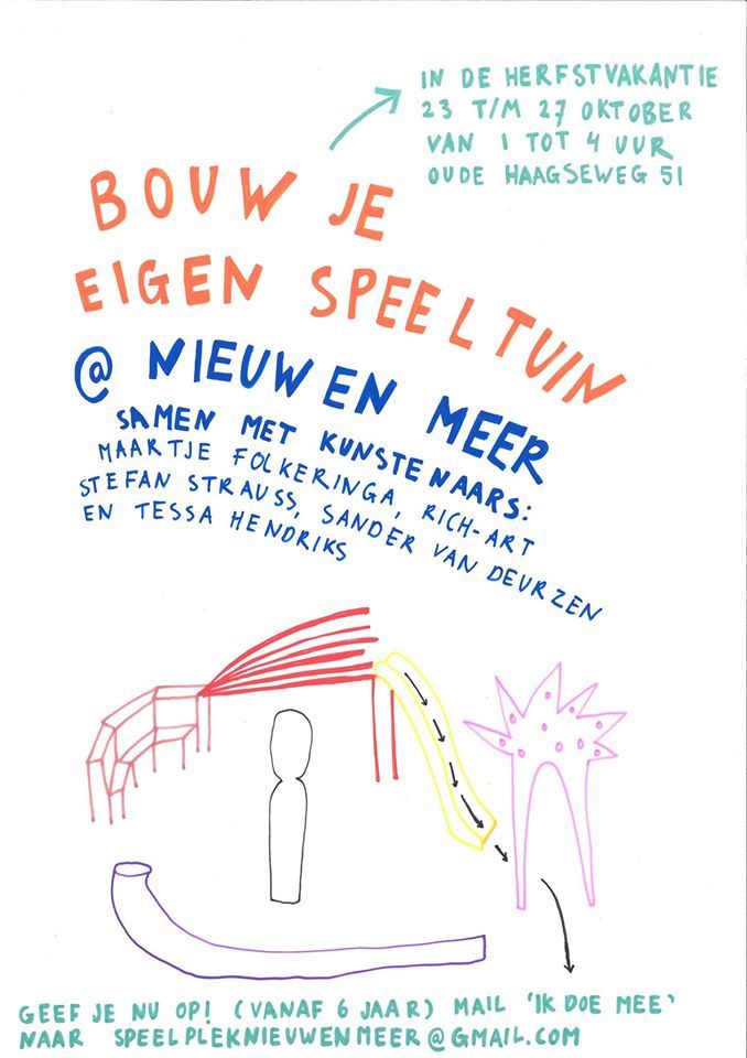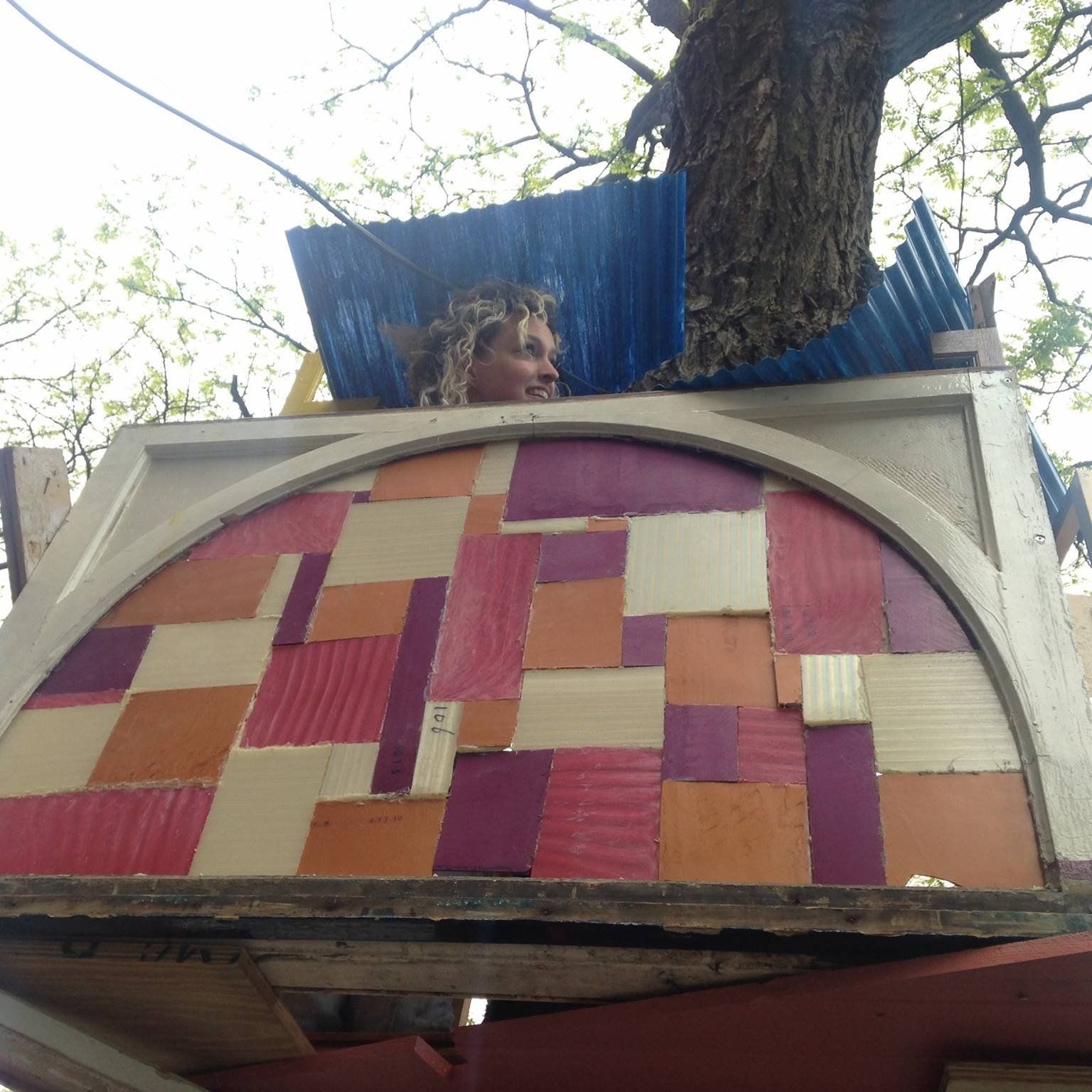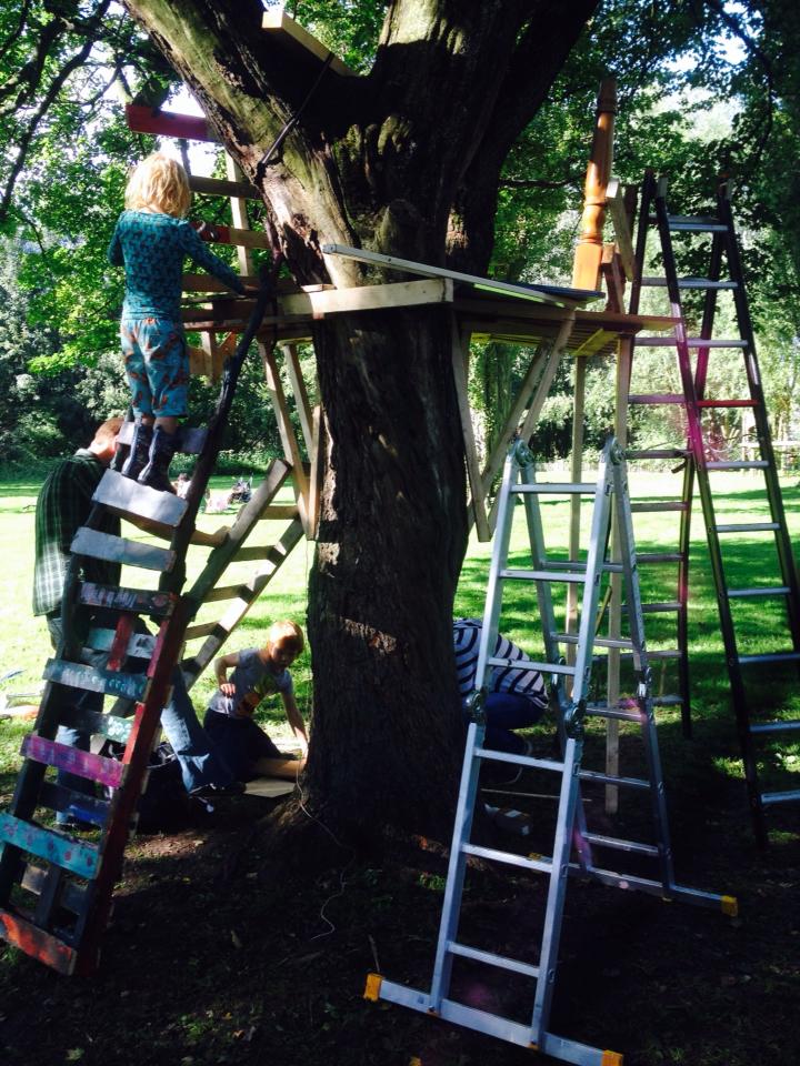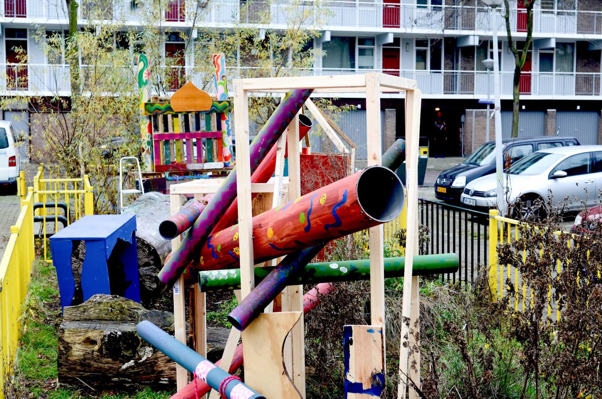 Kunstenaars en kinderen van de Nieuw en Meer bouwen met behulp van het boomhuttenmeisje hun eigen speelplek.