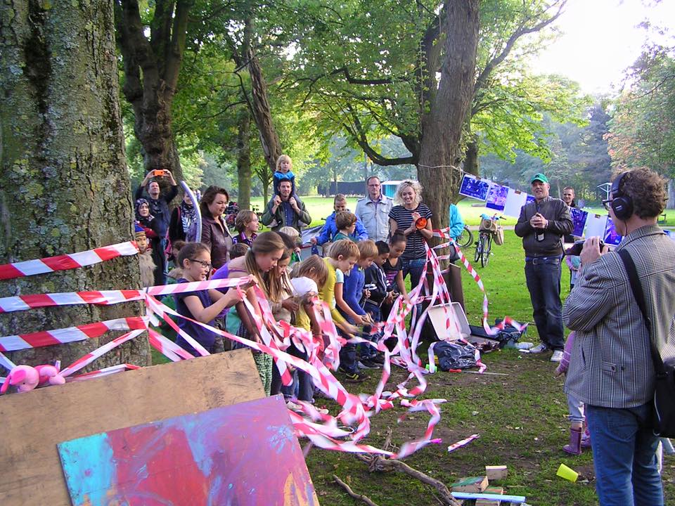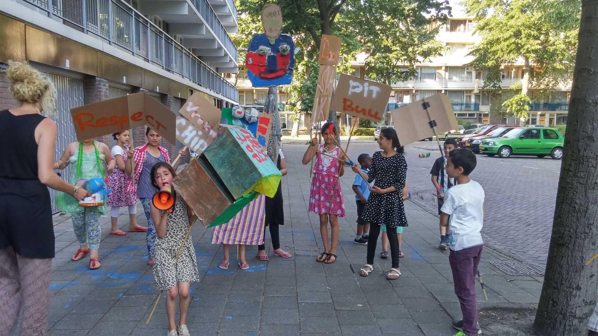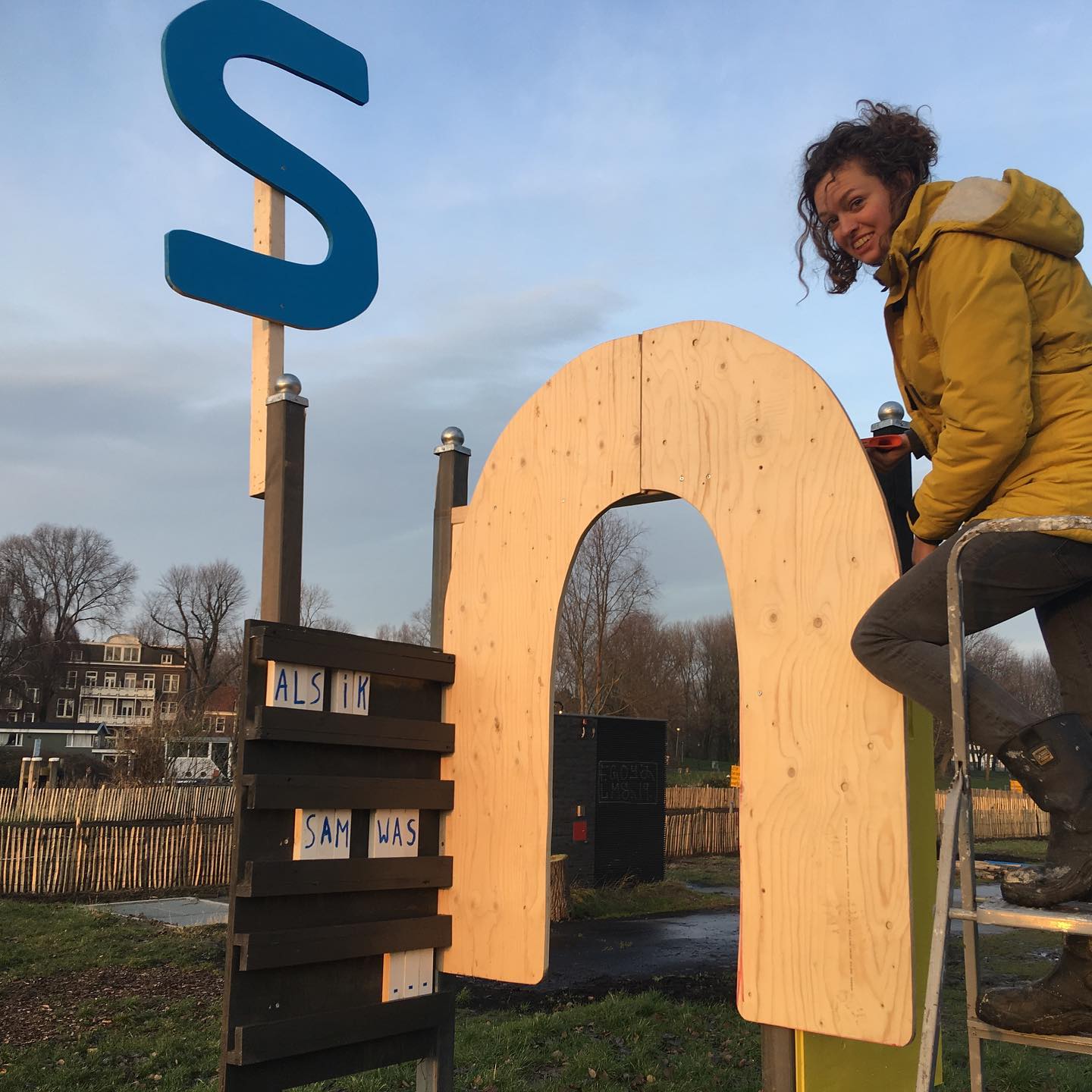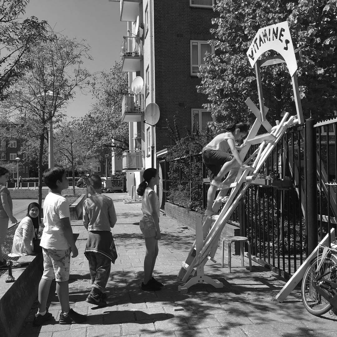 Kunstenaars en kinderen van de Nieuw en Meer bouwen met behulp van het boomhuttenmeisje hun eigen speelplek.