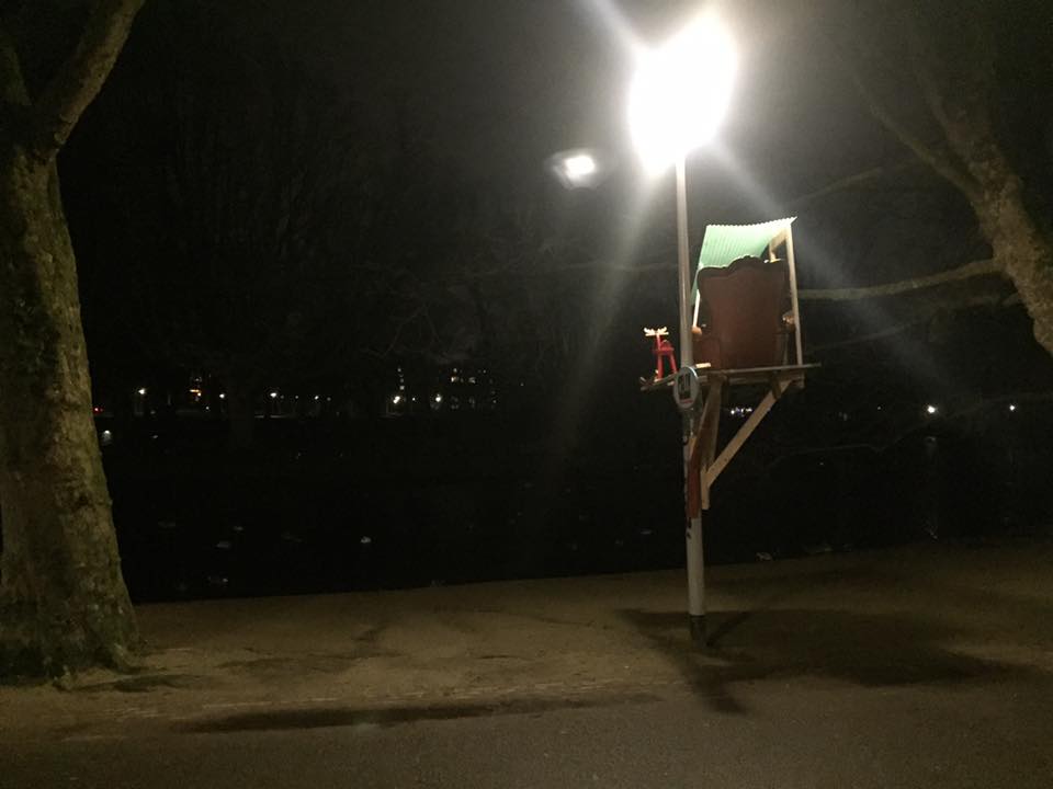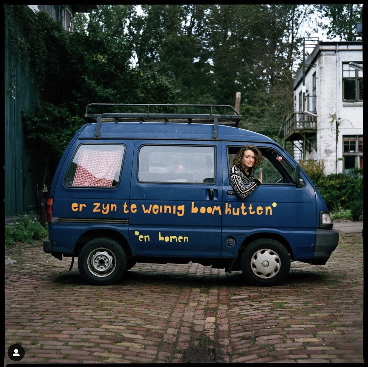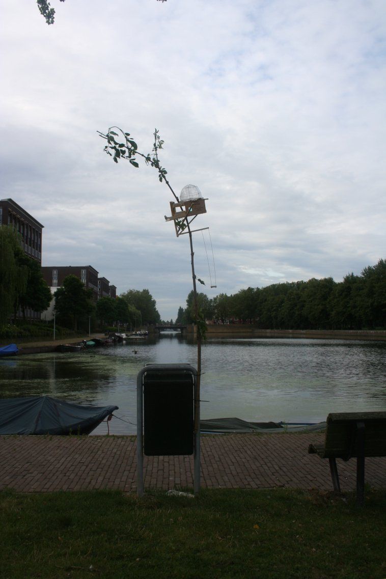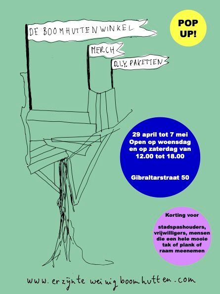 In de Witte de Withstraat hang ik het boomhuttenmanifest in de vitrine en kruip ik zelf in de boom aan de overkant.