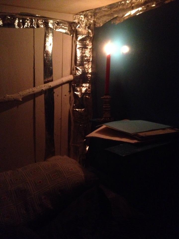 Ik test het dak de eerste nacht en de 2e nacht mag de winnaar van de bingo in deze hut slapen! Het stormt 's nachts en ik moet een verklaring opstellen waarin ik alle verantwoordelijkheid op me neem. De volgende ochtend staat er bijna geen tent meer overeind. Bij deze verklaar ik mijn bouwstijl bestand tegen windkracht 9 :)