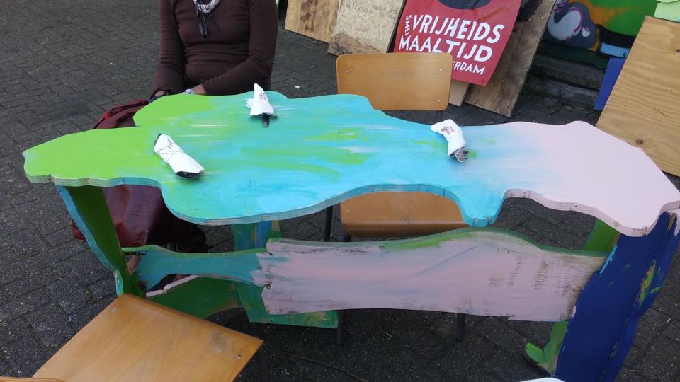 Buttonvoor bevrijdingsdag kunnen mensen samen tafels bouwen waar vervolgens een vrijheidsmaaltijd aan genuttigd kan worden.Als je samen een tafel bouwt wordt je namelijk vrienden,of opz'n minst goede kennissen (samenwerking met Frouwkje Smit, de theaterstraat en de onkruidenier)