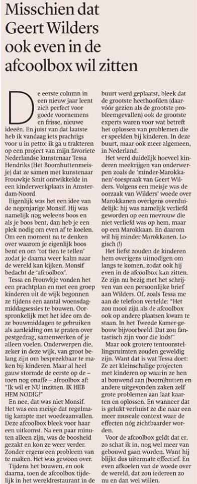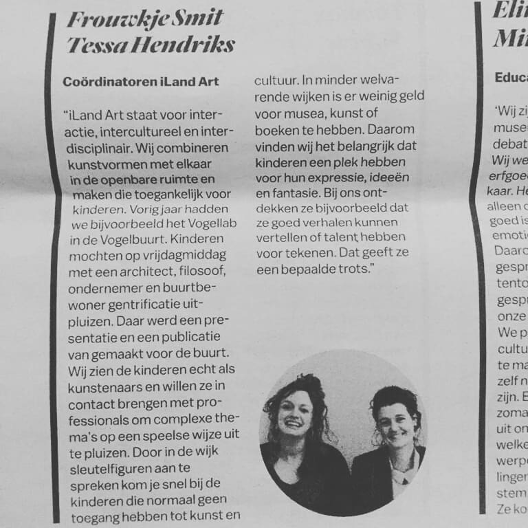 Tessa Hendriks was trained at the Hogeschool voor de Kunsten Utrecht as a teacher in visual arts. She also specialized in installation and sculpture at the Koninklijke Academie voor Schone Kunsten Antwerpen. Urban environments and interactions with inhabitants fascinate her, yet at the same time she is a romantic who gives shape to her dreams