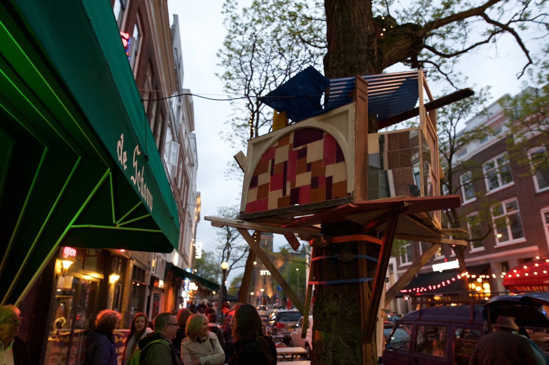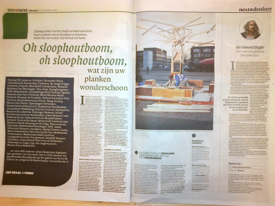 The BOOKSTORE PROJECT SPACE is perfect for a public tree house. The white walls and large windows frame the work, everyone is welcome here. It consists of three small trees, braches actually, and collected waste materials from building sites. This all settled and grew to become a site specific artwork. City and woods, culture and nature, abstract and realist, it all comes together in the gallery. After sunset the installation enlightens like a beating heart. Inhabitants stop to give it a peek and visitors can rest inside.